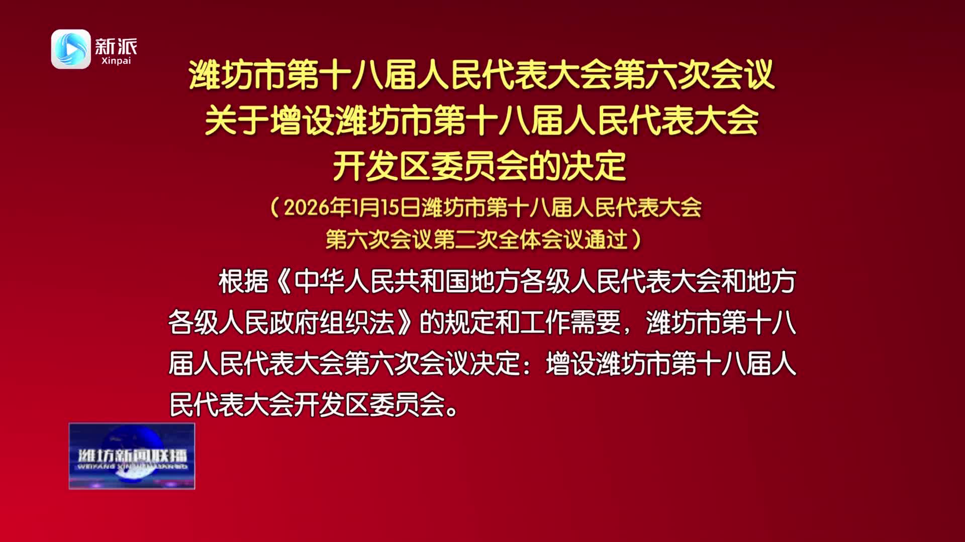 【濰坊新聞聯(lián)播】濰坊市第十八屆人民代表大會(huì)第六次會(huì)議 關(guān)于增設(shè)濰坊市第十八屆人民代表大會(huì) 開發(fā)區(qū)委員會(huì)的決定