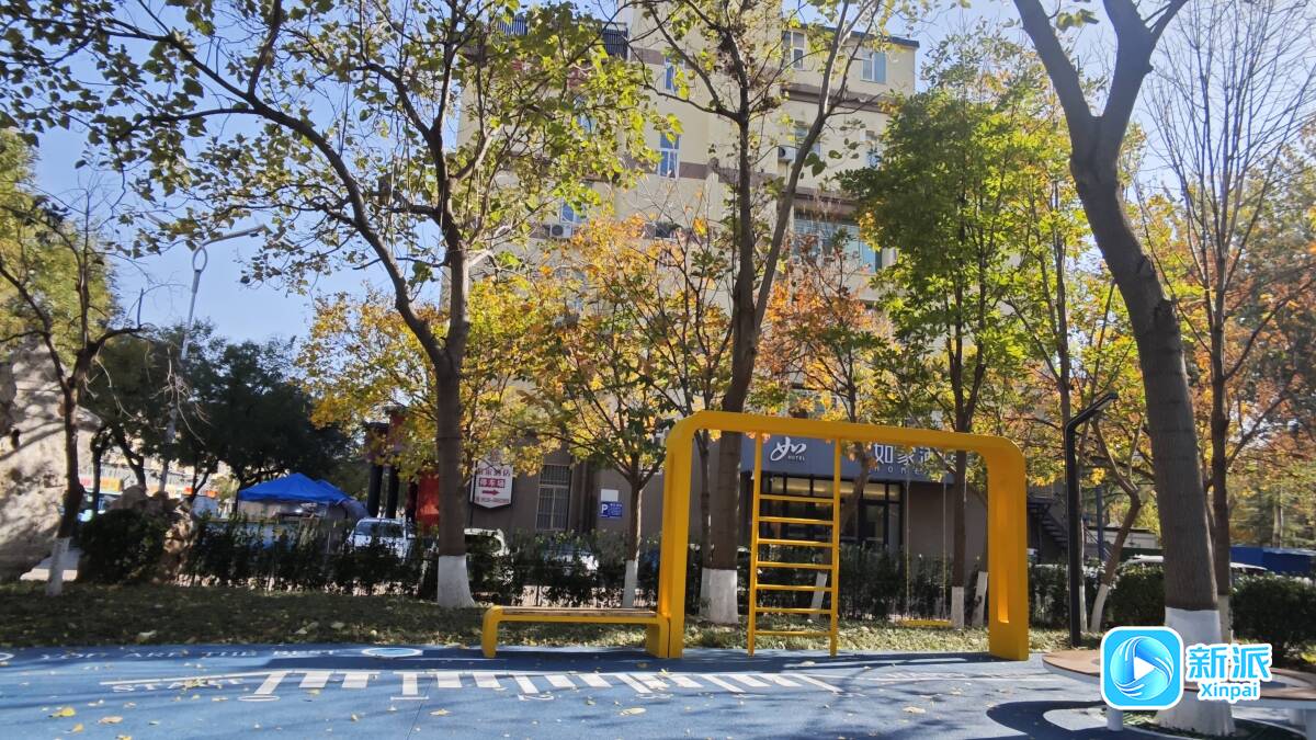 沿新華路與勝利東街交叉口東南角信步東行,首先迎接訪客的是聚焦《中華人民共和國(guó)民營(yíng)經(jīng)濟(jì)促進(jìn)法》宣傳的“正誠(chéng)園”。一入園,幾棵高大的泡桐樹(shù)亭亭如蓋,以其為中心巧妙構(gòu)建了一處林下休憩空間。地面采用清新的藍(lán)色透水鋪裝,其間描繪以“守法篤行”等字樣與運(yùn)動(dòng)圖案,環(huán)繞樹(shù)干的休閑座椅為市民提供了小憩的場(chǎng)所,而東側(cè)亮黃色的攀爬架與座椅則以其明快的色彩,點(diǎn)亮了冬日的角落,充滿了活力。