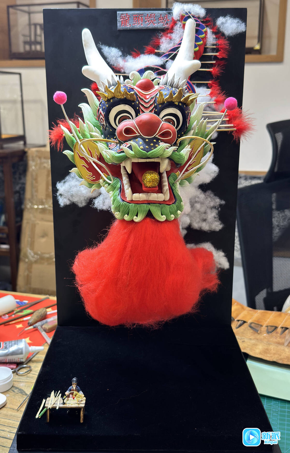 新派訊 11月22日,在濰坊十笏園非遺空間,濰坊孟氏面塑第五代傳承人孟祥祥正在制作“龍頭蜈蚣”面塑作品。據(jù)了解,整個(gè)作品高53厘米、寬30厘米,其中“龍頭蜈蚣”風(fēng)箏部分長(zhǎng)28厘米、寬20厘米,后面有16個(gè)腰片,整體造型如同風(fēng)箏在空中飛翔。作品底部則是一名濰坊風(fēng)箏老藝人正在制作風(fēng)箏的場(chǎng)景,桌案上擺放著扎制風(fēng)箏的各種材料和一個(gè)1厘米見方的風(fēng)箏骨架,巧奪天工的面塑技藝令人嘖嘖稱奇。