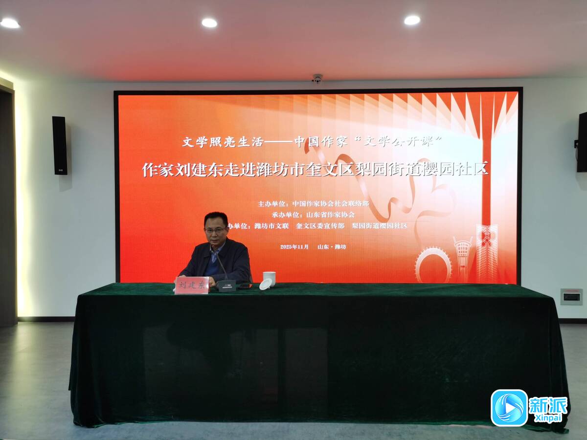 中國(guó)作家協(xié)會(huì)全委會(huì)委員、河北省作家協(xié)會(huì)主席、魯迅文學(xué)獎(jiǎng)獲得者劉建東作為中國(guó)作協(xié)文學(xué)志愿服務(wù)團(tuán)作家,走進(jìn)奎文區(qū)梨園街道櫻園社區(qū),以“小說(shuō)的發(fā)生和發(fā)展”為主題,從個(gè)人的創(chuàng)作經(jīng)驗(yàn)到文學(xué)發(fā)展的普遍經(jīng)驗(yàn),詳細(xì)講述小說(shuō)的靈感與來(lái)源、如何推動(dòng)小說(shuō)故事情節(jié)發(fā)展等內(nèi)容,與濰坊的眾多文學(xué)愛(ài)好者分享了他的創(chuàng)作歷程、創(chuàng)作經(jīng)驗(yàn),并與大家進(jìn)行文學(xué)交流。
