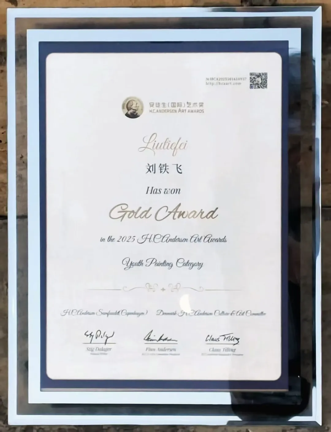本屆安徒生國際藝術獎以“FRIENDSHIP”(友誼)為主題,劉鐵飛作為國際和平藝術家,其作品《友誼使者》完美契合了該主題,獲得最高獎:評委會金獎,并被丹麥王國安徒生文化藝術發(fā)展委員會收藏。