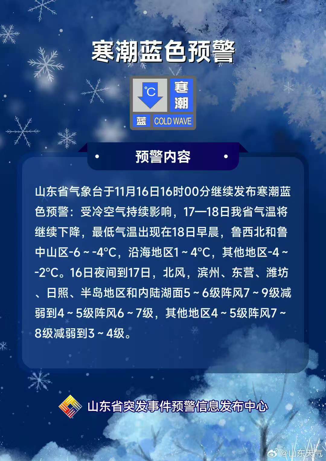 11月16日這天,山東持續(xù)多日的晴好天氣被今冬首場(chǎng)寒潮“一刀切”!記者從山東省氣象臺(tái)了解到,受冷空氣影響,16日魯西北和魯中地區(qū)出現(xiàn)大風(fēng)降溫天氣,17—18日我省氣溫將繼續(xù)下降,最低氣溫出現(xiàn)在18日早晨,直接開啟 “速凍模式”,魯西北和魯中山區(qū)-6~-4℃,沿海地區(qū)1~4℃,其他地區(qū)-4~-2℃。省氣象臺(tái)16日16時(shí)繼續(xù)發(fā)布寒潮藍(lán)色預(yù)警。